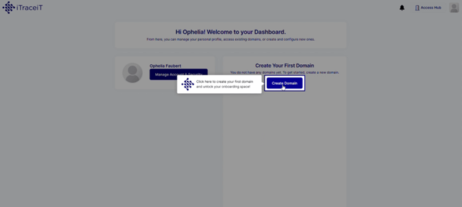 When you log in for the first time, your dashboard (hub) displays the option to create your first Domain.