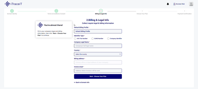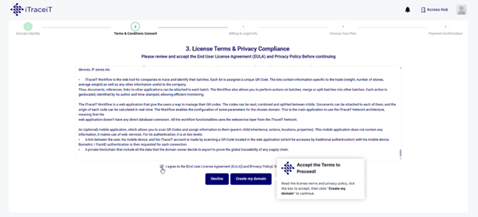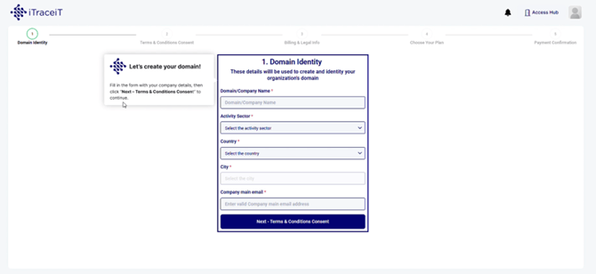 Creating your first Domain is the starting point of your onboarding journey in iTraceiT. A Domain represents your organization inside the platform and serves as your secure workspace. This is where you will manage your billing details, users, traceability actions, parcel imports and all operations related to your supply chain.
