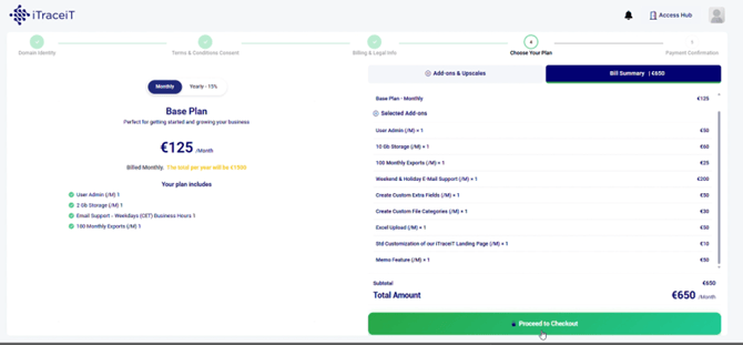 After selecting your plan and add-ons, click on the tab Bill Summary, then on the button Proceed to Checkout.
