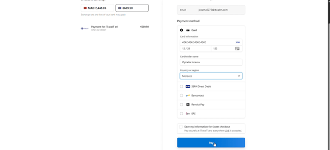 Select your currency, enter your card details and click on the button Pay to finalize your subscription.