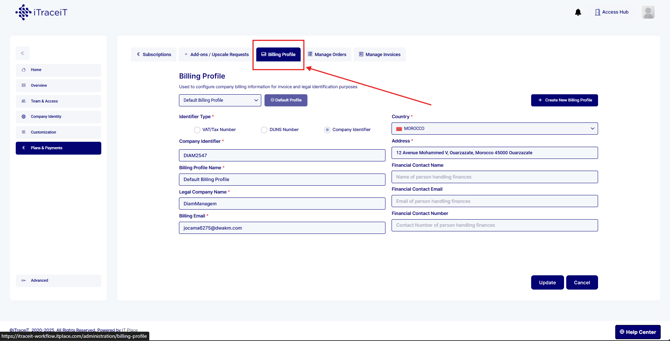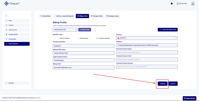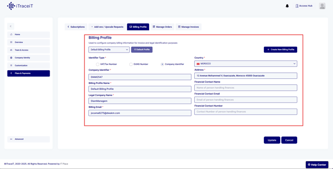 Managing your billing details ensures that your subscription, invoices and payment information remain accurate and up to date. iTraceiT allows domain administrators to update billing data directly in the Plans and Payments section.