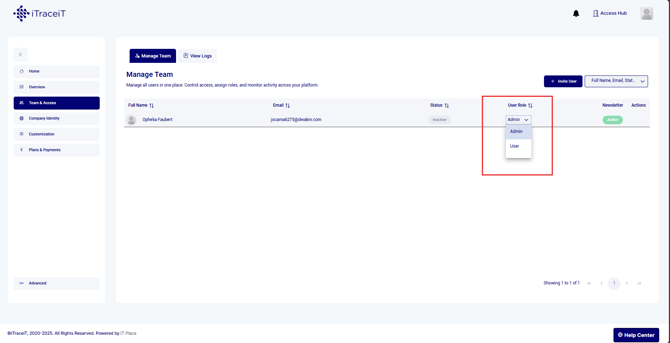 Managing user permissions ensures that each person in your domain has the correct level of access to perform their work. iTraceiT uses two main roles, Admin and User, which define what each individual can view or control within the domain.