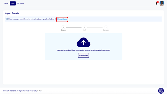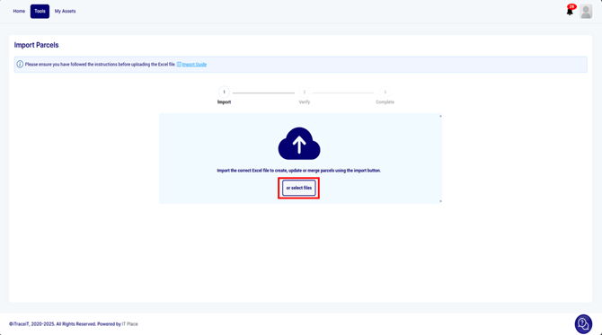 4. Go back to the Import Parcel ‘s page. Drag and drop your file or click on “Select Files” to import your excel and follow the process