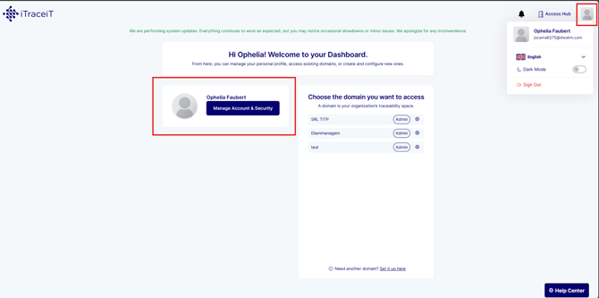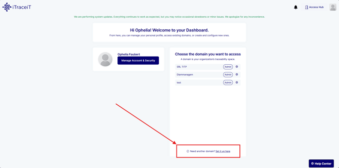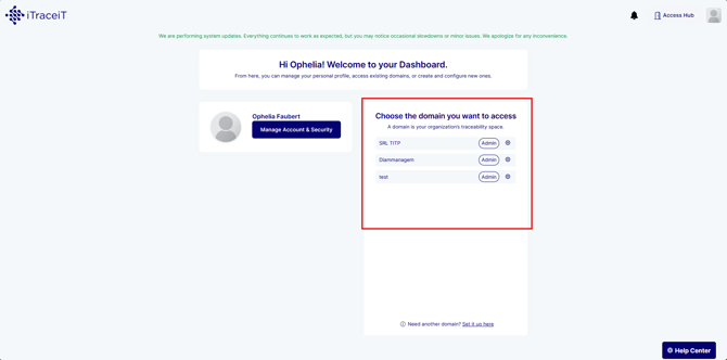 The Access Hub is the main entry point to iTraceiT. It allows you to manage your profile, access your domains, create new domains, and view notifications before starting operational work