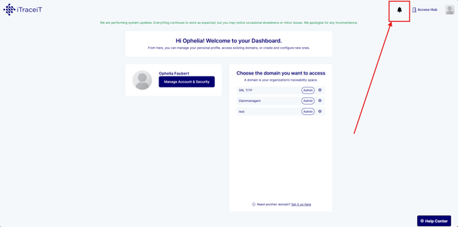 In the top right corner of the Access Hub, you will find the notifications icon. Notifications inform you about important updates such as invitations to domains, system messages, or platform-level announcements.