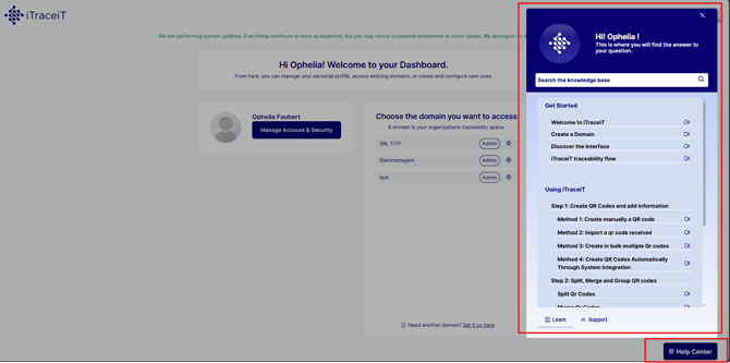 When you log in to iTraceiT, you first arrive in the Access Hub. This page is designed to help you get oriented before entering any domain. From here, you can manage your personal account, choose which domain to work in, or create a new domain if needed.