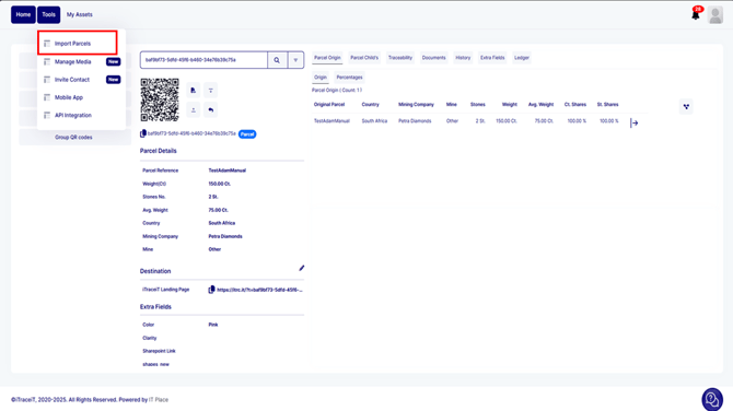 Splitting QR Codes helps you manage production with precision while maintaining full traceability and certification alignment. Each child parcel remains linked to its parent, ensuring that the entire transformation process from the original rough parcel to the finished stones is transparent and verifiable. By using the split functionality, you reinforce the accuracy of your traceability data and demonstrate operational discipline within the SCS-certified supply chain.
