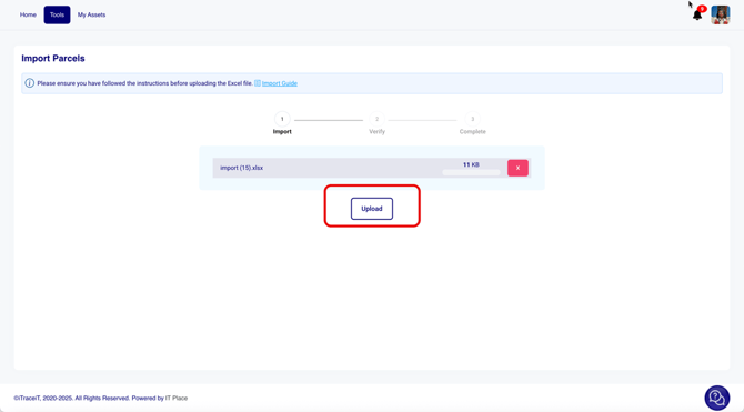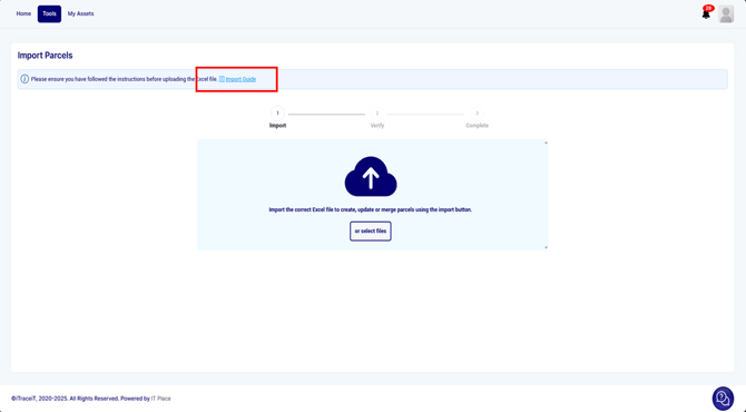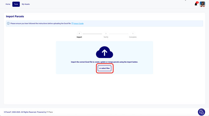 - Step 7: Return to the Import Parcels screen. Drag and drop the file or click Select Files to upload it.