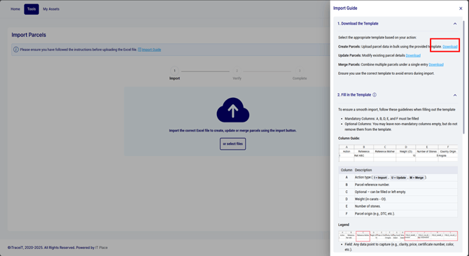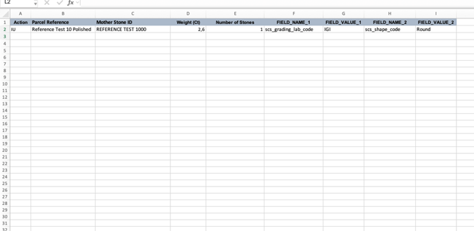 - For each additional child, add a new line in the Excel file with its specific Parcel Reference ID, Mother Stone ID, weight, number of stones, and extra fields.