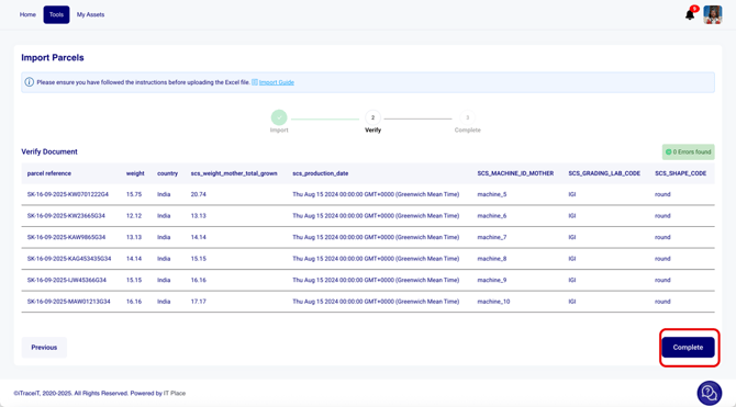 - Step 8: The system will automatically check your file for errors. If there are no errors, click on Complete. The system will generate and register the QR Codes in your database.