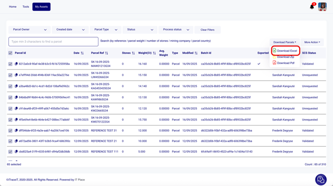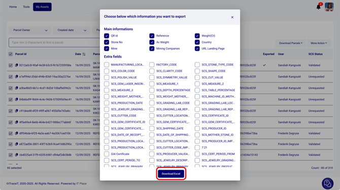 - Step 6: A pop-up will appear asking you to confirm the data that should be included in the Excel file. By default, fields such as QR ID, reference, and weight are already selected. Review the list then click “Download Excel”.