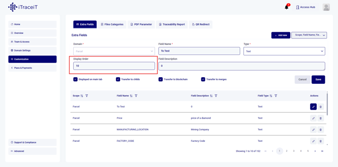 - Display Order: When you assign a number in the Display Order field, iTraceiT uses this value to determine the order in which fields appear. The system reads these values in ascending order, meaning that fields with lower numbers appear first in the list.